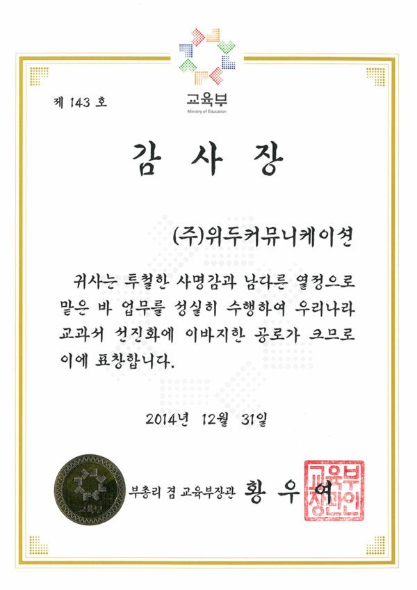 감사장 제 143호 페이지 정보 작성자 WeDu 댓글 0건 조회 6,313회 작성일 19-05-30 19:33 본문 2014-12-31 감사장 제 143호 교과서 선진화 부총리 겸 교육부장관 황우여 List Previous산업통상자원부 표창장 19.05.30 Next한국여성벤처협회 표창장 19.05.30