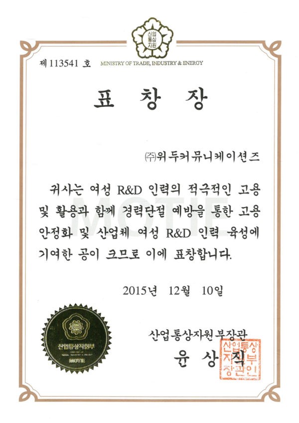 산업통상자원부 표창장 페이지 정보 작성자 WeDu 댓글 0건 조회 6,510회 작성일 19-05-30 19:34 본문 2015-12-10 표창장 제 113541호 여성 R&D 인력 고용 산업통상자원부장관 윤상직 List Previous서울클러스터 어워드 우수상 19.05.30 Next감사장 제 143호 19.05.30