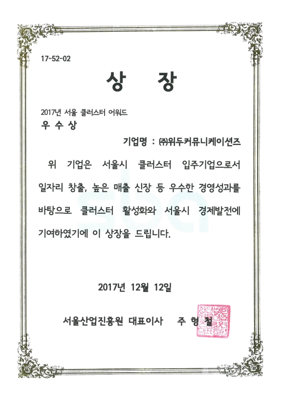 서울클러스터 어워드 우수상 페이지 정보 작성자 WeDu 댓글 0건 조회 7,283회 작성일 19-05-30 19:34 본문 2017-12-12 우수상 17-52-02 서울클러스터 어워드 서울산업진흥원 대표이사 주형철 List Previous서울특별시장 표창장 19.05.30 Next산업통상자원부 표창장 19.05.30