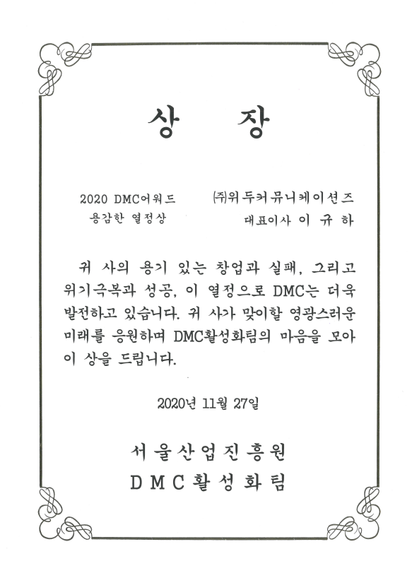 2020 서울산업진흥원 2020 DMC어워드 페이지 정보 작성자 WeDu 댓글 0건 조회 5,989회 작성일 21-12-31 12:57 본문 2020-11-27 2020 DMC어워드 용감한 열정상 서울산업진흥원 DMC활성화팀 List Previous2020 기술혁신 우수기업 21.12.31 Next2018 소년한국 우수 어린이 도서 19.05.30