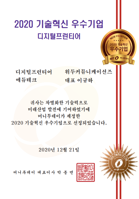 2020 기술혁신 우수기업 페이지 정보 작성자 WeDu 댓글 0건 조회 6,498회 작성일 21-12-31 12:58 본문 2020-12-21 2020 기술혁신 우수기업 디지털프런티어 에듀테크 머니투데이 대표이사 List Previous2020 소년한국 우수 어린이 도서 선정 21.12.31 Next2020 서울산업진흥원 2020 DMC어워드 21.12.31