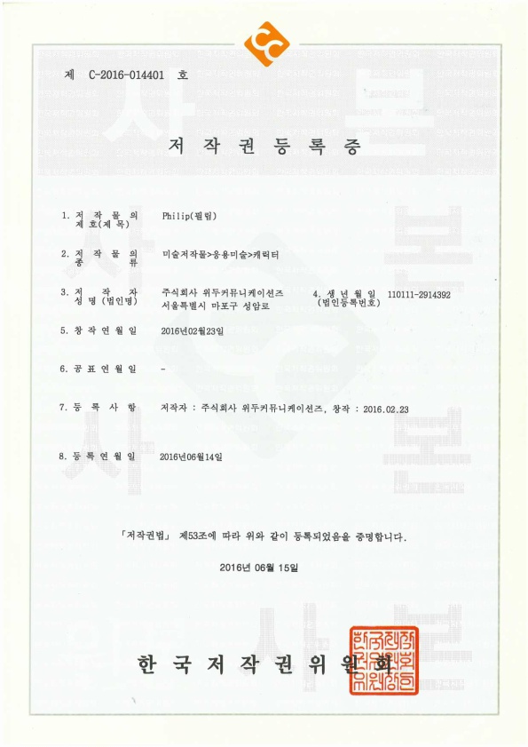 [한국/저작권] 필립 페이지 정보 작성자 WeDu 댓글 0건 조회 6,279회 작성일 19-05-30 19:09 본문 2016-06-14 저작권 C-2016-014401 필립 / 미술저작물>응용미술>캐릭터 List Previous[한국/저작권] 월터 19.05.30 Next[한국/저작권] 아리스 19.05.30